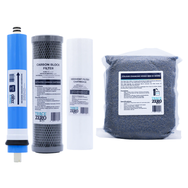 The Trace Zero RO/DI Refresh Kit is a complete maintenance pack designed to restore your reverse osmosis system to peak performance. This bundle includes the core filtration stages required to produce ultra-pure water: a 1 µm sediment filter, a 1 µm carbon block, high-performance colour-changing mixed bed DI resin, and your choice of a premium Trace Zero RO membrane. Whether you're maintaining a reef aquarium, operating an aquaculture facility, or producing high-purity source water, this kit ensures consistent, reliable, zero-TDS output.