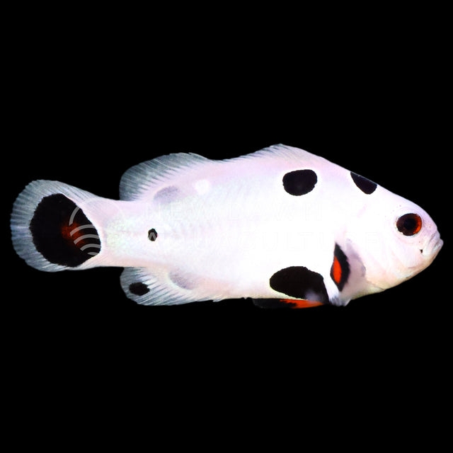 TheSuper Storm Clownfish is one of the most striking designer variants of Amphiprion ocellaris, bred for its bold patterning and contrast. Originating from the Storm lineage, this morph features a near-solid white body with smooth, exaggerated connecting barring and rich black margins accenting every fin. Subtle orange, mocha, or black color “windows” break through the white body, creating a dramatic, high-contrast appearance that stands out in any reef display.
