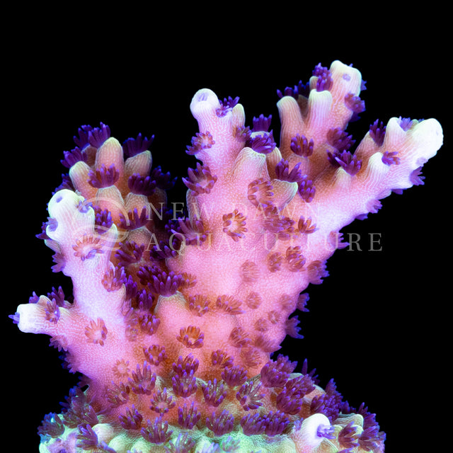 Pink Cadillac is a classic strain of Acropora divaricata that has been aquacultured for a number of years now. These corals are most well known for their dark purple polyps that contrast the otherwise bright coral. The branches of a Pink Cadillac have golden tips that fade to bright pink. As the colony grows you'll start to see it fade again to a light green colour further down the branches and it will develop a green interior. A fully grown colony of Pink Cadillac is truly stunning and looks just as remarkable in both blue and white light spectrums.