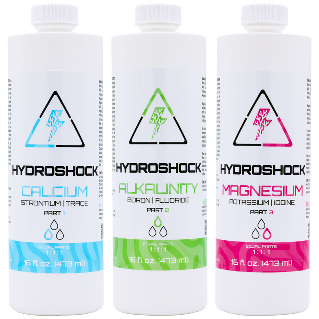 The Hydroshock 3-Part Complete System is a precision-balanced dosing trio designed to provide reef aquariums with stable water chemistry, consistent growth, and vibrant coloration. Formulated to work together in a 1:1:1 ratio, Hydroshock maintains the proper balance of major and minor ions while preventing long-term imbalances.
